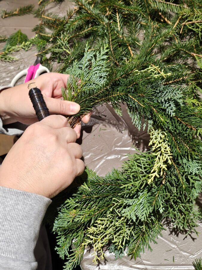 フレッシュなモミや常緑樹の葉っぱを使い、まるで森の中にいるような香りがするオリジナルのクリスマスリースを作ります。