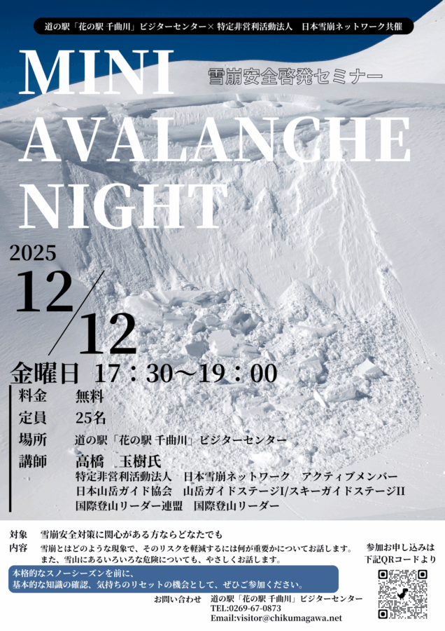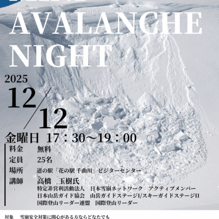 ビジターセンターでは、雪崩対策の一環として、特定非営利活動法人日本雪崩ネットワーク(JAN)との共催で「ミニ・アバランチナイト」を開催します。