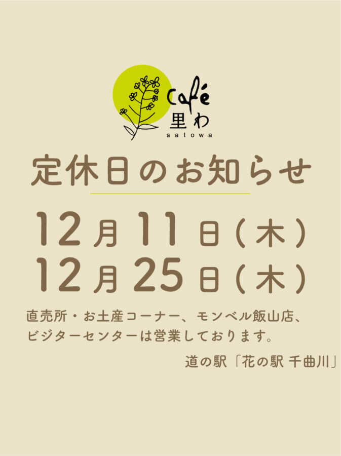 12月11日(木)、25日(木)はCafe里わの定休日です。 ・農産物直売所・お土産コーナー、モンベル飯山店、ビジターセンターは営業しております。 ・観光情報コーナー、トイレ、公衆電話・自販機コーナーは、24時間ご利用いただけます。お客さまにはご迷惑をお掛けしますが、よろしくお願いいたします。